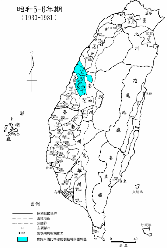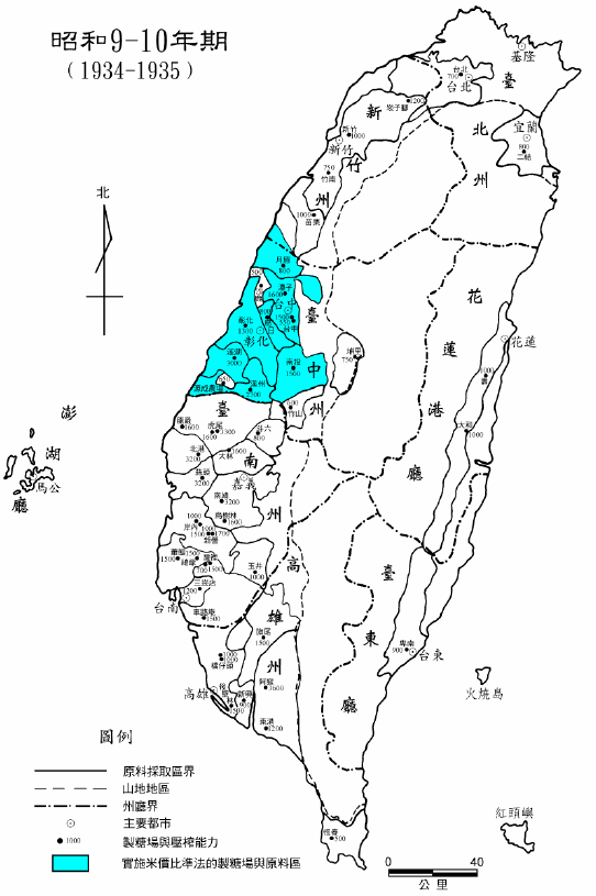 昭和5-6 年期實施米價比準法的原料蔗作區。
