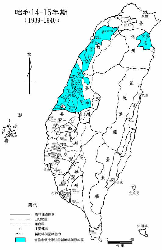 昭和14-15 年期實施米價比準法的原料蔗作區